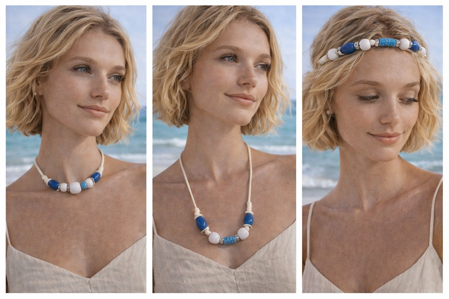 Certains de mes colliers sont ajustables et peuvent se porter de différentes façons: en ras de cou, en collier plus long ou en bandeau dans les cheveux.